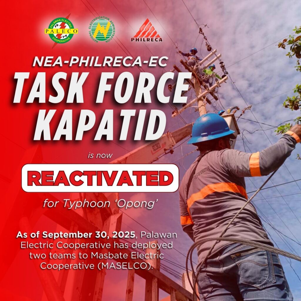 Paleco Sends 12 Strong Linemen to Masbate to Aid in Typhoon Opong Recovery The Palawan Electric Cooperative (Paleco) has deployed 12 of its linemen to Masbate Island to help restore electricity and rebuild power lines devastated by the onslaught of typhoon Opong. The deployment is part of the nationwide mutual assistance program or Task Force Kapatid […]