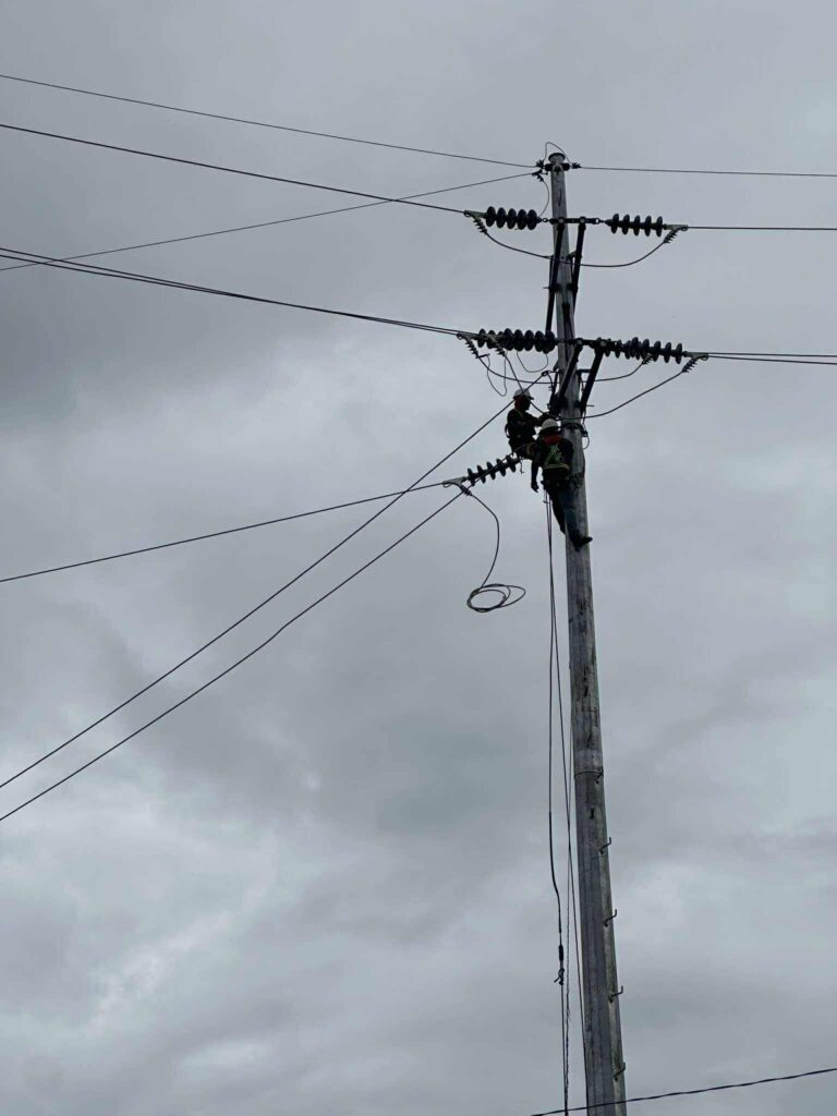 NPC WARRIORS OF LIGHT IN ACTION: Pagsasagawa ng paglilipat ng poste ng 69 kV transmission line, na naapektuhan ng ginawagawang road widening ng Department of Public Works and Highways (DPWH), ng mga kawani ng National Power Corporation (NPC) sa South National Highway, Barangay Sicsican ngayong araw, ika-16 ng Agosto.