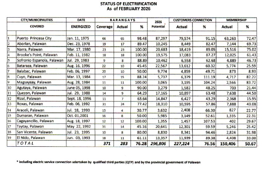 As of February 2026, PALECO energized 283 barangays out of 371 barangays within its franchise area. It has 227,224 house connections or 76.56 percent of the potential house connection of 296,806 and has 150,406 members. This is continuously increasing because of the ongoing line extensions of the Cooperative funded by National Government, Local Government Units, PALECO itself, and private entities/individuals.