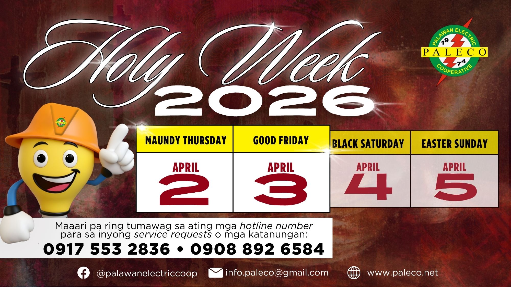 Please be informed that PALECO offices are closed today and tomorrow, April 2 and 3, in observance of the holiday.