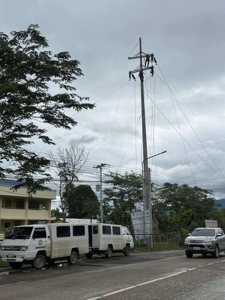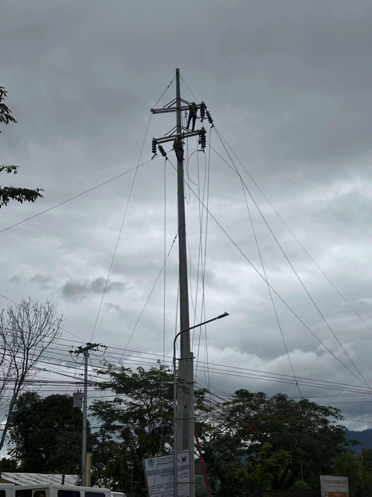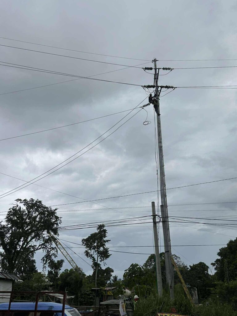 Pagsasagawa ng paglilipat ng poste ng 69 kV transmission line, na naapektuhan ng ginawagawang road widening ng Department of Public Works and Highways (DPWH), ng mga kawani ng National Power Corporation (NPC) sa South National Highway, Barangay Sicsican ngayong araw, ika-16 ng Agosto.
