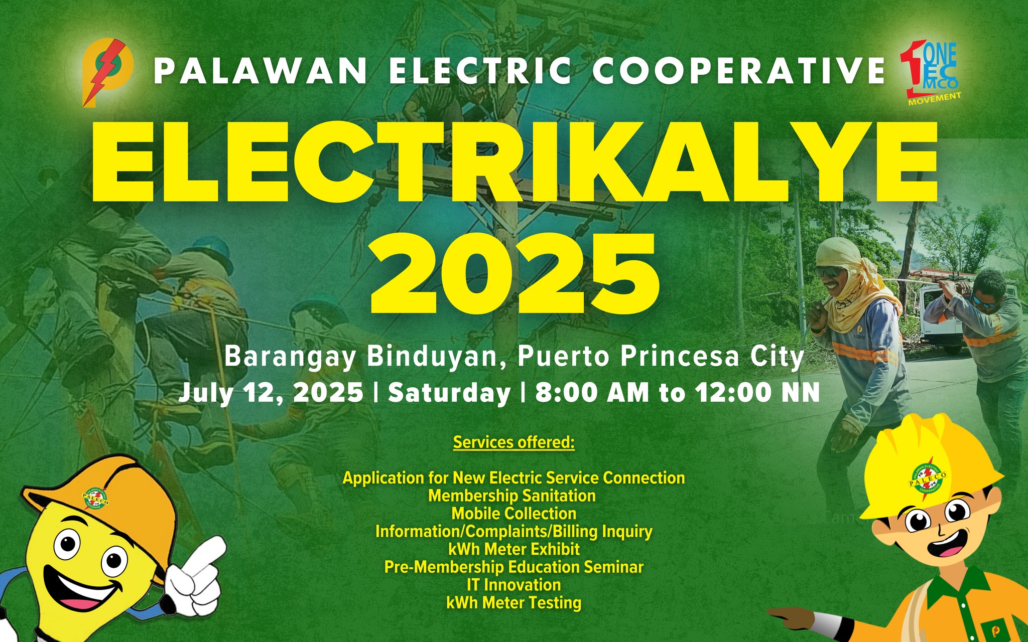 Sa layuning mailapit ang serbisyong ibinibigay ng Palawan Electric Cooperative (Paleco) sa mga member-consumer-owner nito, isasagawa ang Electrikalye sa Covered Court ng Barangay Binduyan, Lungsod ng Puerto Princesa sa Sabado, ika-12 ng Hulyo, mula 8:00 ng umaga hanggang 12:00 ng tanghali.