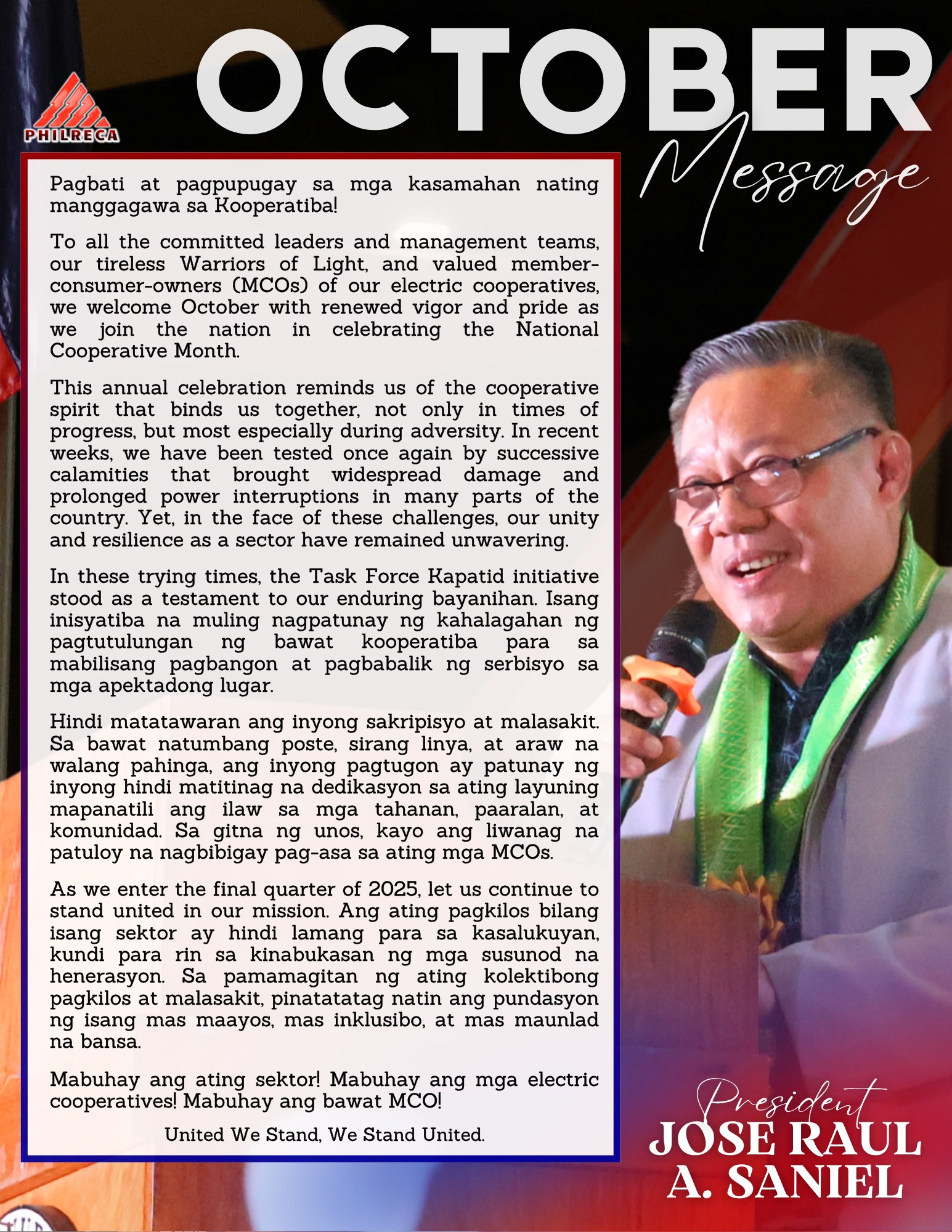 To all the committed leaders and management teams, our tireless Warriors of Light, and valued member-consumer-owners (MCOs) of our electric cooperatives, we welcome October with renewed vigor and pride as we join the nation in celebrating the National Cooperative Month.