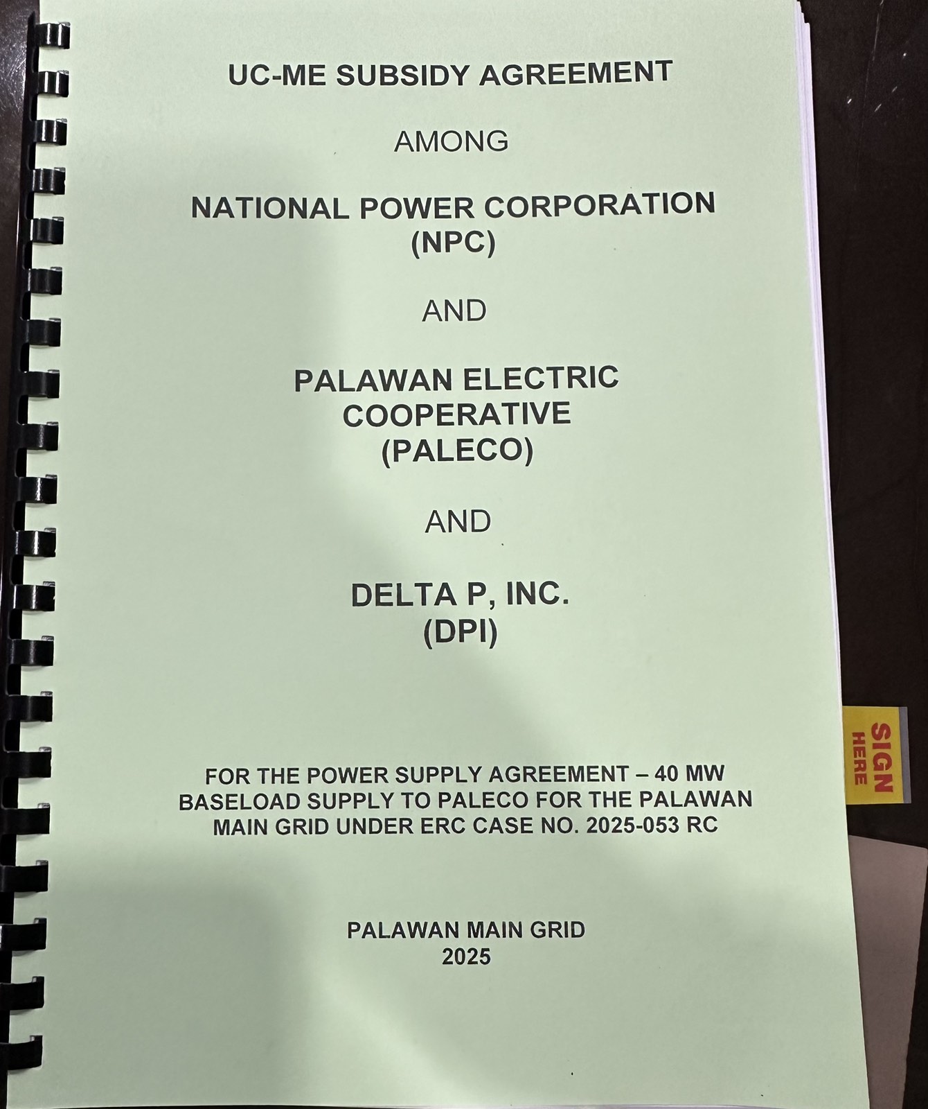 Nilagdaan na nina Engr. Rez L. Contrivida, General Manager ng Palawan Electric Cooperative (Paleco), at Atty. Fe Marie D. Tagle, Chairperson ng Interim Board of Directors ng Kooperatiba, ang Universal Charge for Missionary Electrification (UCME) Subsidy Agreement sa pagitan ng PALECO, Delta P, Inc. (DPI) at National Power Corporation (NAPOCOR) para sa 40 MW Power Supply Agreement (PSA) sa pagitan naman ng PALECO at Delta P noong ika-16 ng Setyembre.