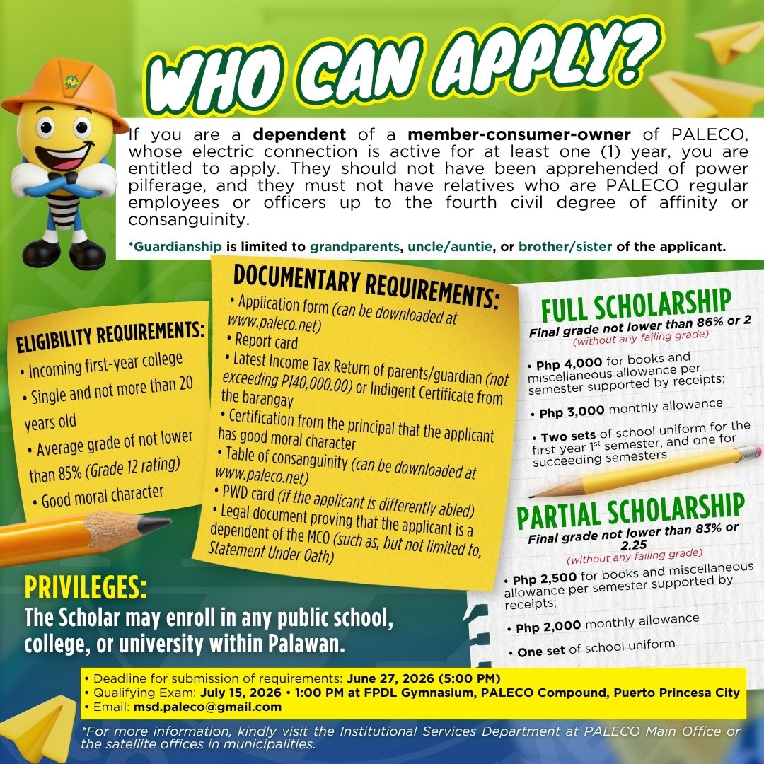 For more information, kindly visit the Members Services Division of the Institutional Services Department (MSD-ISD) at PALECO Main Office, Km 3.35, North National Highway, Brgy. Tiniguiban, Puerto Princesa City or the nearest PALECO Satellite Office to you.