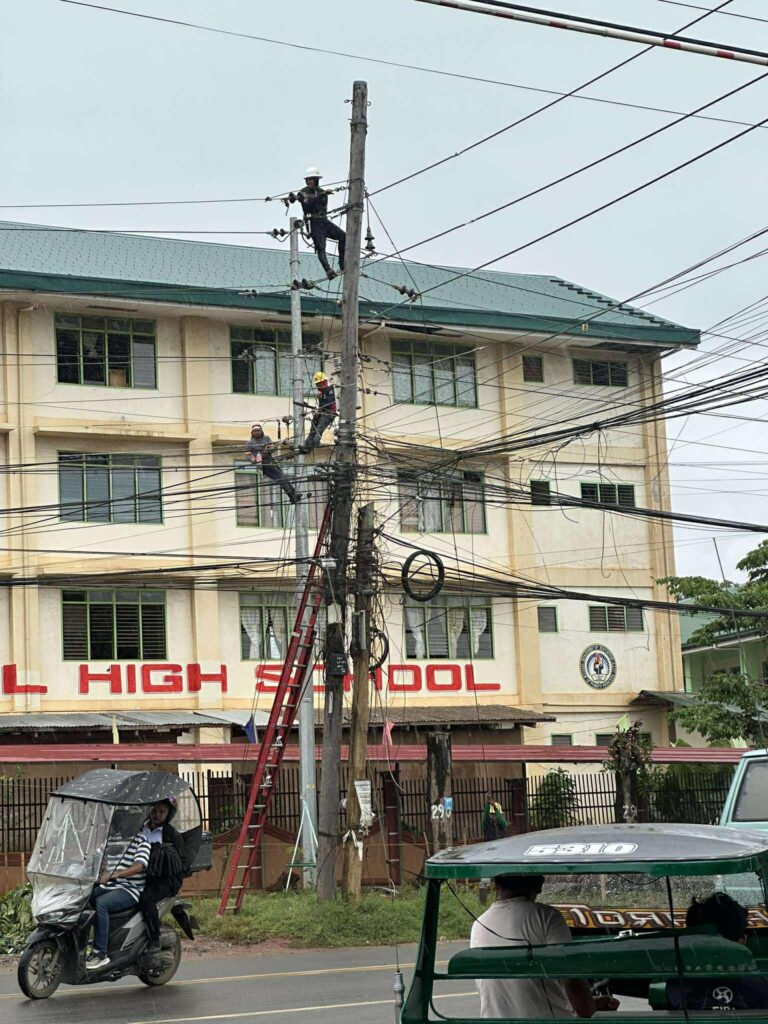 PALECO WARRIORS OF LIGHT IN ACTION Sa kabila ng masamang panahon, kasalukuyang nagsasagawa ng pole relocation ang mga lineworker ng Palawan Electric Cooperative (Paleco) sa may Sta. Monica National High School.